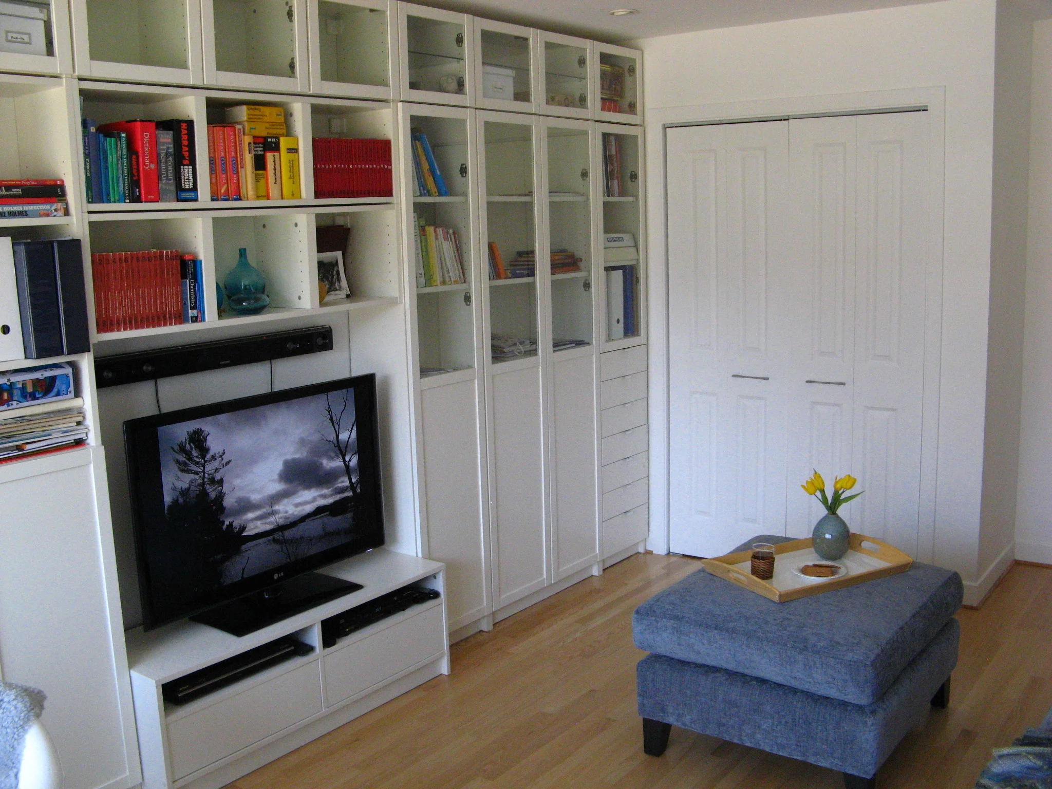 This room is the favorite room of the family. It serves as an office during the day and as a TV space in the evening. An extra long sofa was custom made to fit the whole family. The office chair can be turned around and comfortably used for TV watching. A closet and lots of storage was added for files, books and laundry equipment.